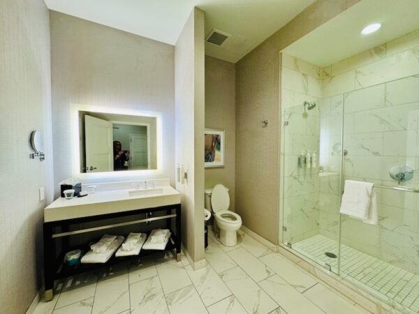 As I mentioned, I maximize my loyalty to Hilton. For this two-night stay, I used Hilton Honors points and cash. I redeemed 58,000 points and paid $210. Did I receive an upgrade? One week before my stay, I received an email from Embassy Suites about an upgrade to my room. Even though the offer ($34) for a Corner Suite was enticing, I did not respond. The day before check-in, I received a notification about digital check-in. In hindsight, I should have selected Room 328 because breakfast and the reception were on the 3rd floor. It would have been convenient to get to both spaces with a room on the same floor. Keep that in mind if you book here. Yes, I received an upgrade to a higher floor (Room 649) with a partial city view.