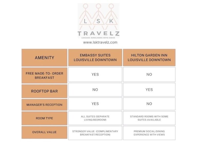 Although I travel to Kentucky often, I rotate my stays between the Embassy Suites and the Hilton Garden Inn (HGI) near Fourth Street Live. Both hotels offer a shuttle to and from the airport. The Embassy Suites offers complimentary breakfast, but you will pay for breakfast at HGI. There is a Manager’s Reception with light snacks and complimentary beer, wine, and spirits at the Embassy Suites. Do not expect a Manager’s Reception at HGI. As a Hilton Honors Diamond Member, I receive a daily food and beverage Credit at HGI. The rooftop view at the HGI is a plus.
