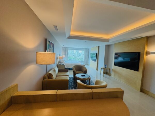 I redeemed 198,000 Hilton Honors points for my five-night stay. Remember, if you use points, the fifth night is free. For the extra night, I used a combination of points (25,000) and cash ($104). My original reservation was for a king bed with an ocean view. Hilton automatically upgraded my room to a king-bed executive suite with a city view. As a Hilton Honors Diamond member, breakfast was complimentary, and I also received access to the Executive Lounge. Why is this important? I saved money on meals. The restaurant had an omelet and smoothie station, and I gathered snacks and water from noon to 8:00PM in the Executive Lounge. Happy hour ran from 5:00PM to 7:00PM for pre-dinner drinks and light bites.
